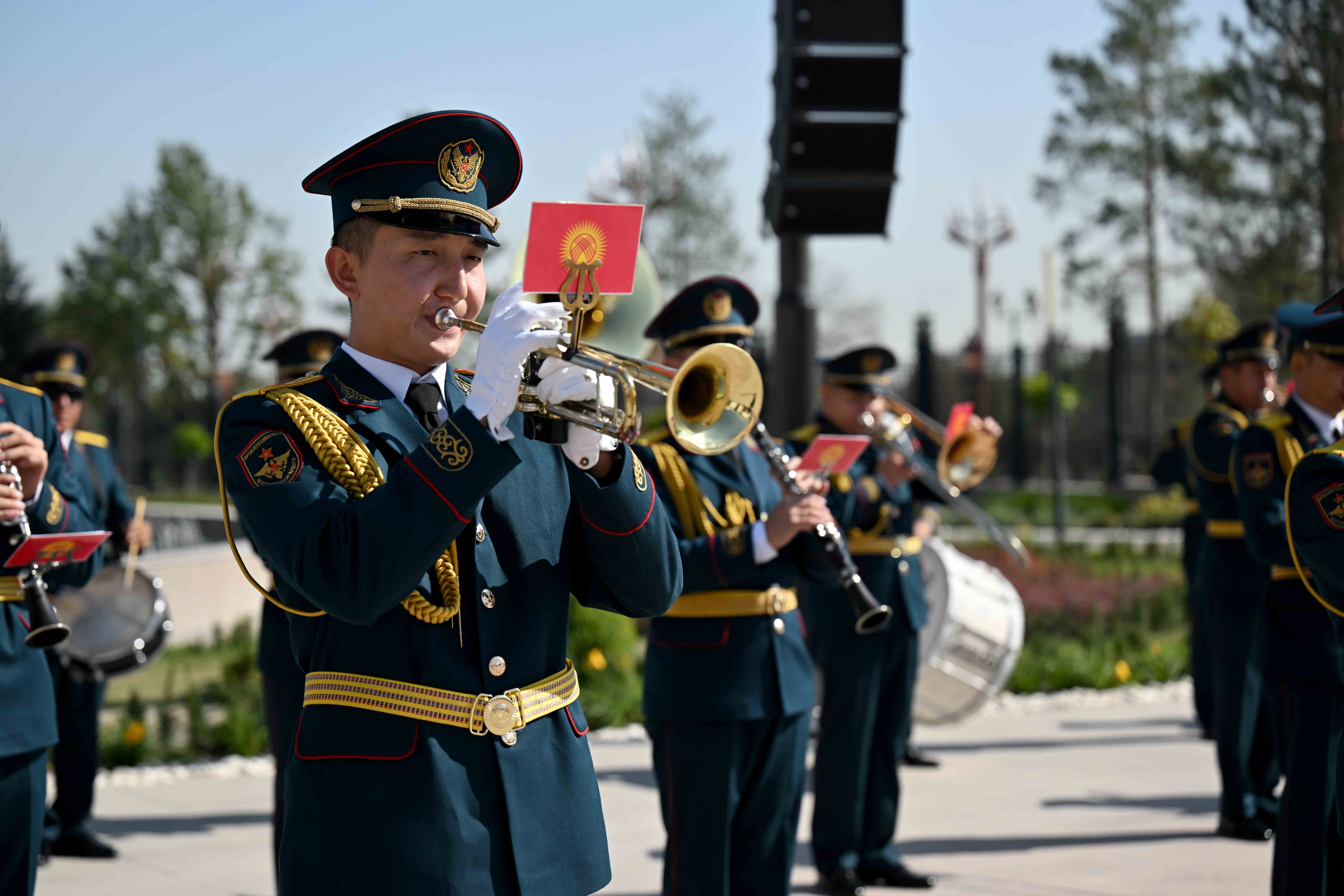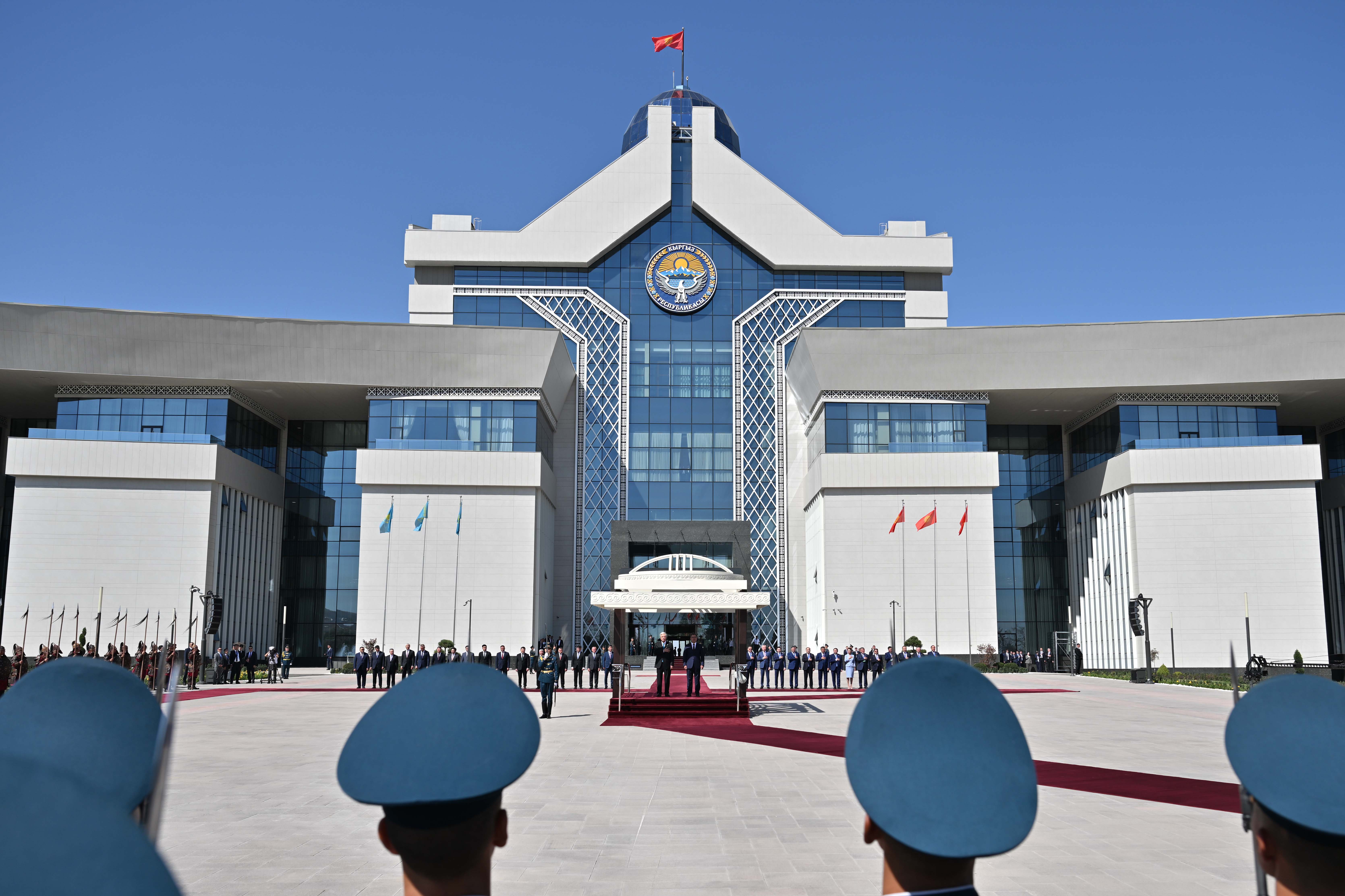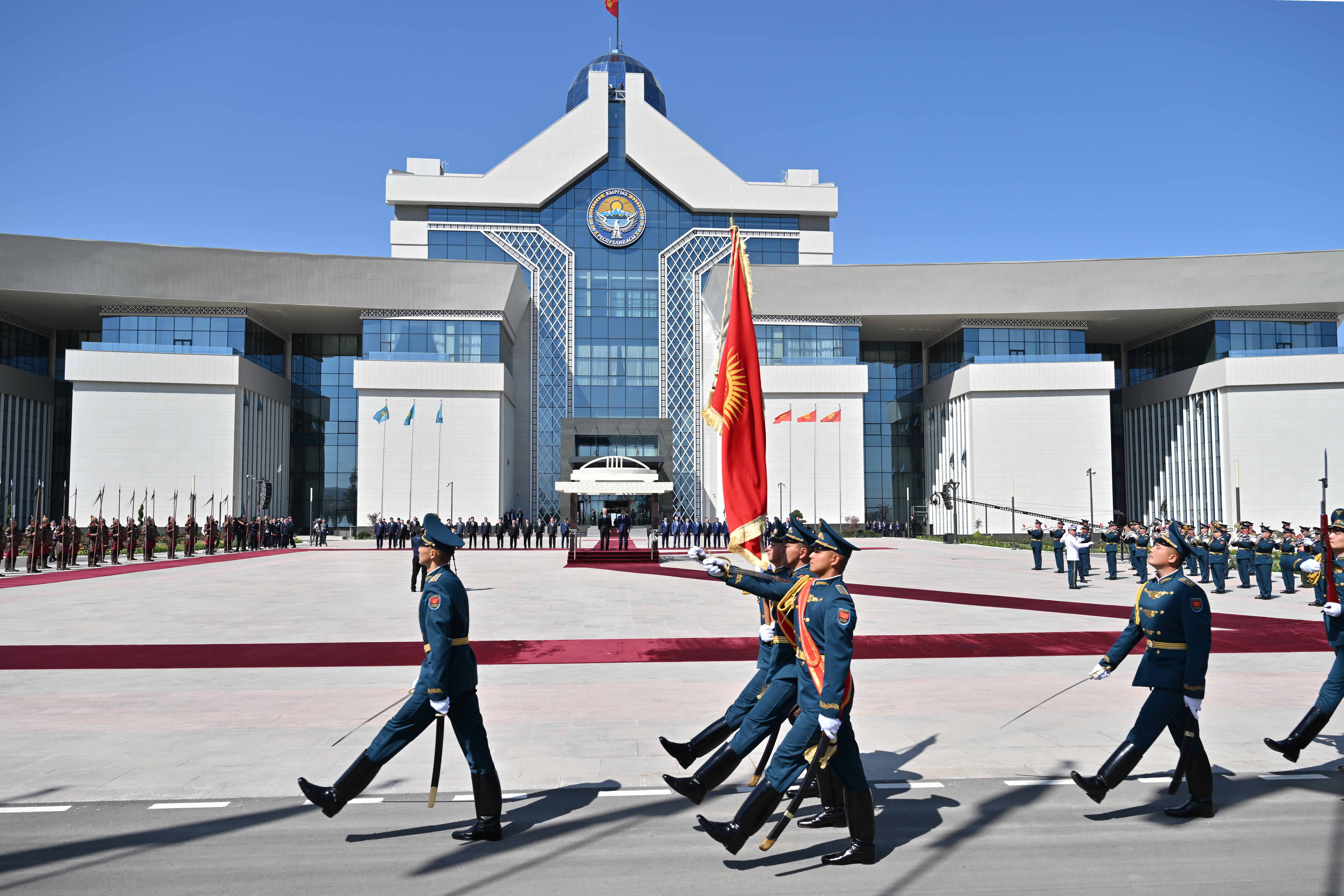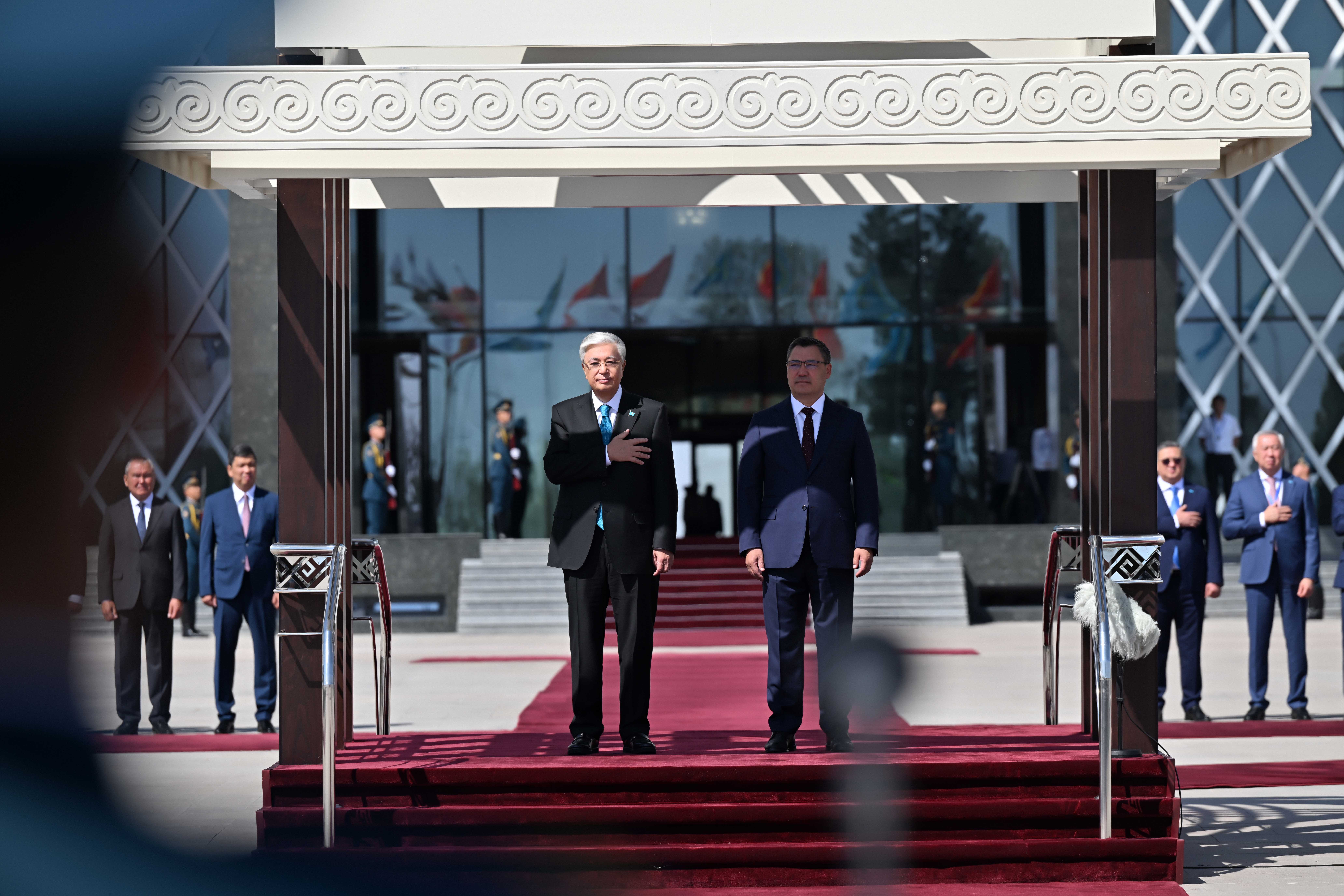 Президенттер бір бірімен амандасқаннан кейін екі елдің мемлекеттік әнұрандары шырқалды. Құрмет қарауылы ротасының бастығы рапорт берген соң, Қасым-Жомарт Тоқаев пен Садыр Жапаров сап түзеген сарбаздардың алдынан жүріп өтті.