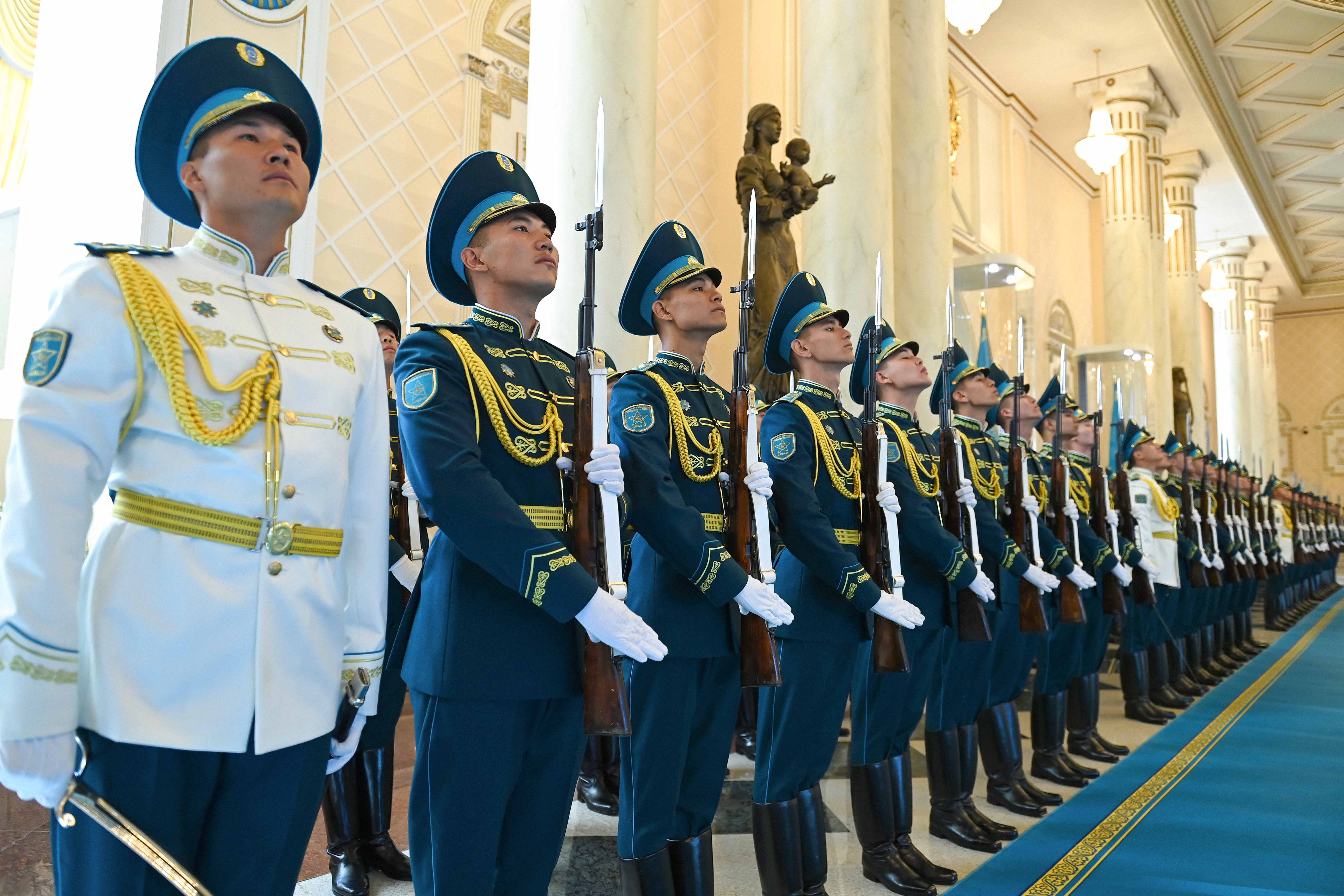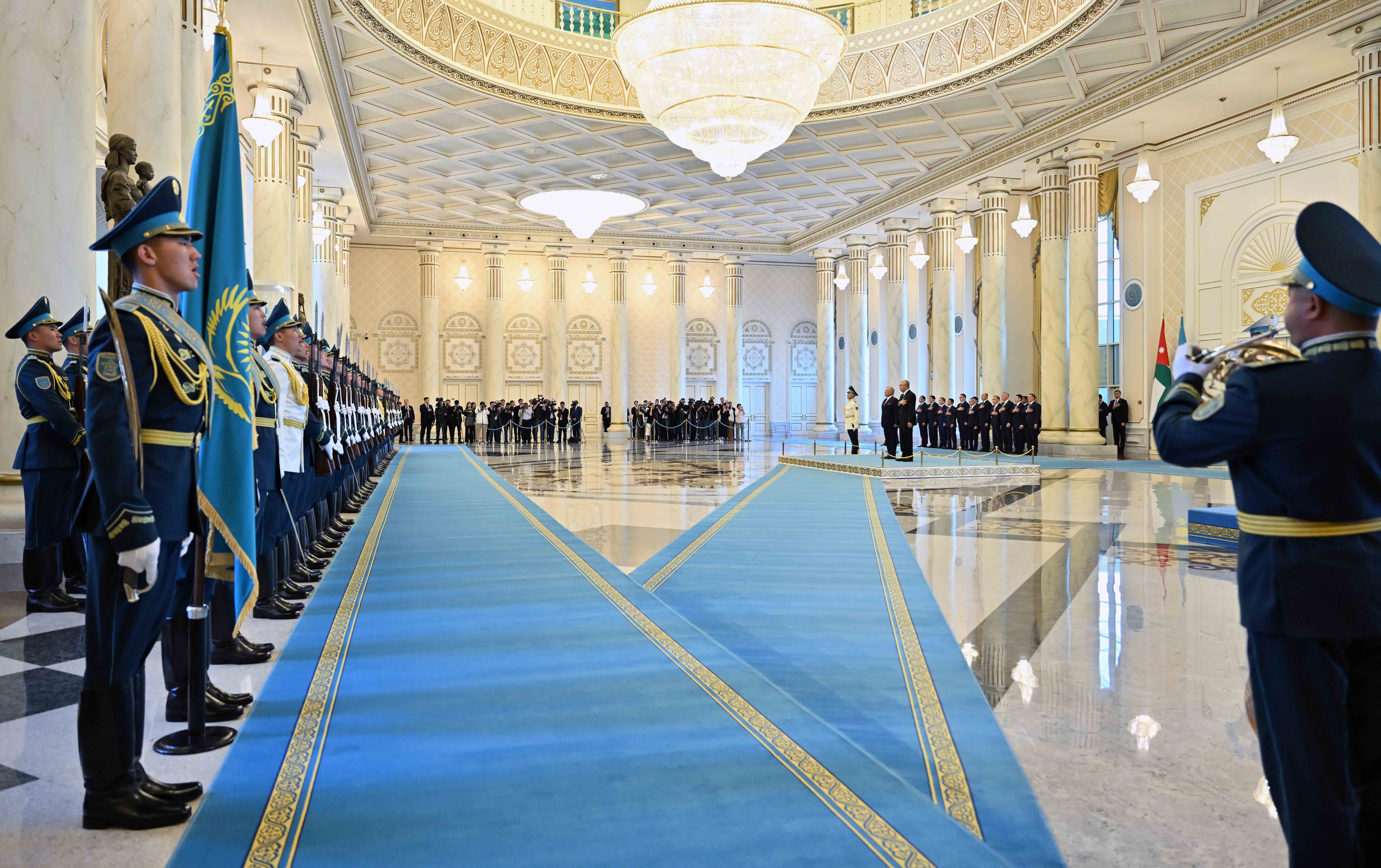 Касым-Жомарт Токаев и Абдалла II представили друг другу членов делегаций, после чего начальник роты почетного караула отдал приветственный рапорт, прозвучали гимны Казахстана и Иордании. Далее главы государств направились в зал переговоров.
