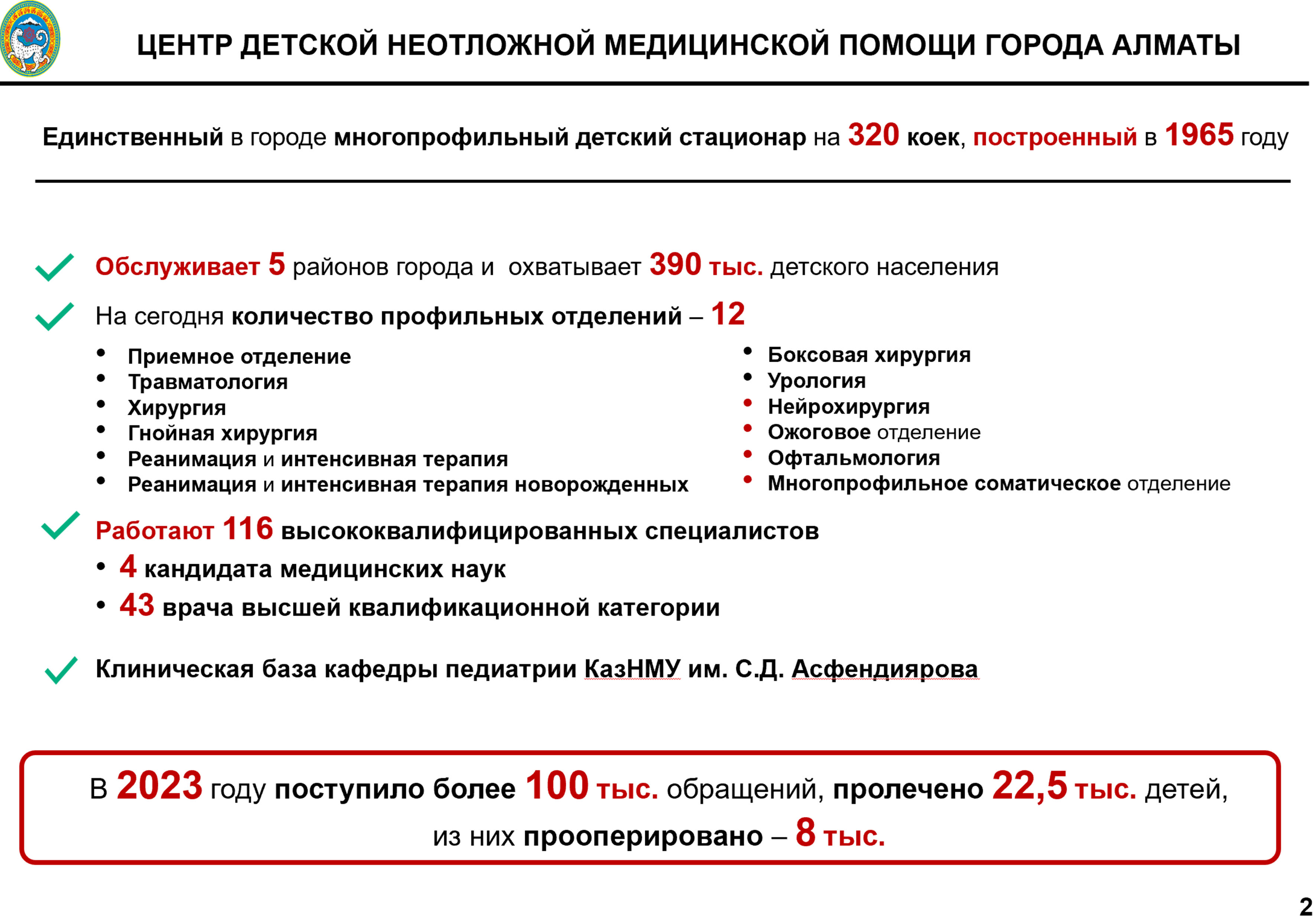 Заместитель акима города Алматы Асем Нусупова рассказала Президенту, что данный детский стационар, построенный в 1965 году, является клинической базой кафедры педиатрии Казахского национального медицинского университета имени С.Д. Асфендиярова. Здесь получают лечение дети не только из Алматы, но и из всех регионов Казахстана. Больница является единственным центром по хирургической коррекции таких врожденных пороков развития, как атрезия пищевода, диафрагмальная грыжа, рахишизис, гастрошизис и другие.