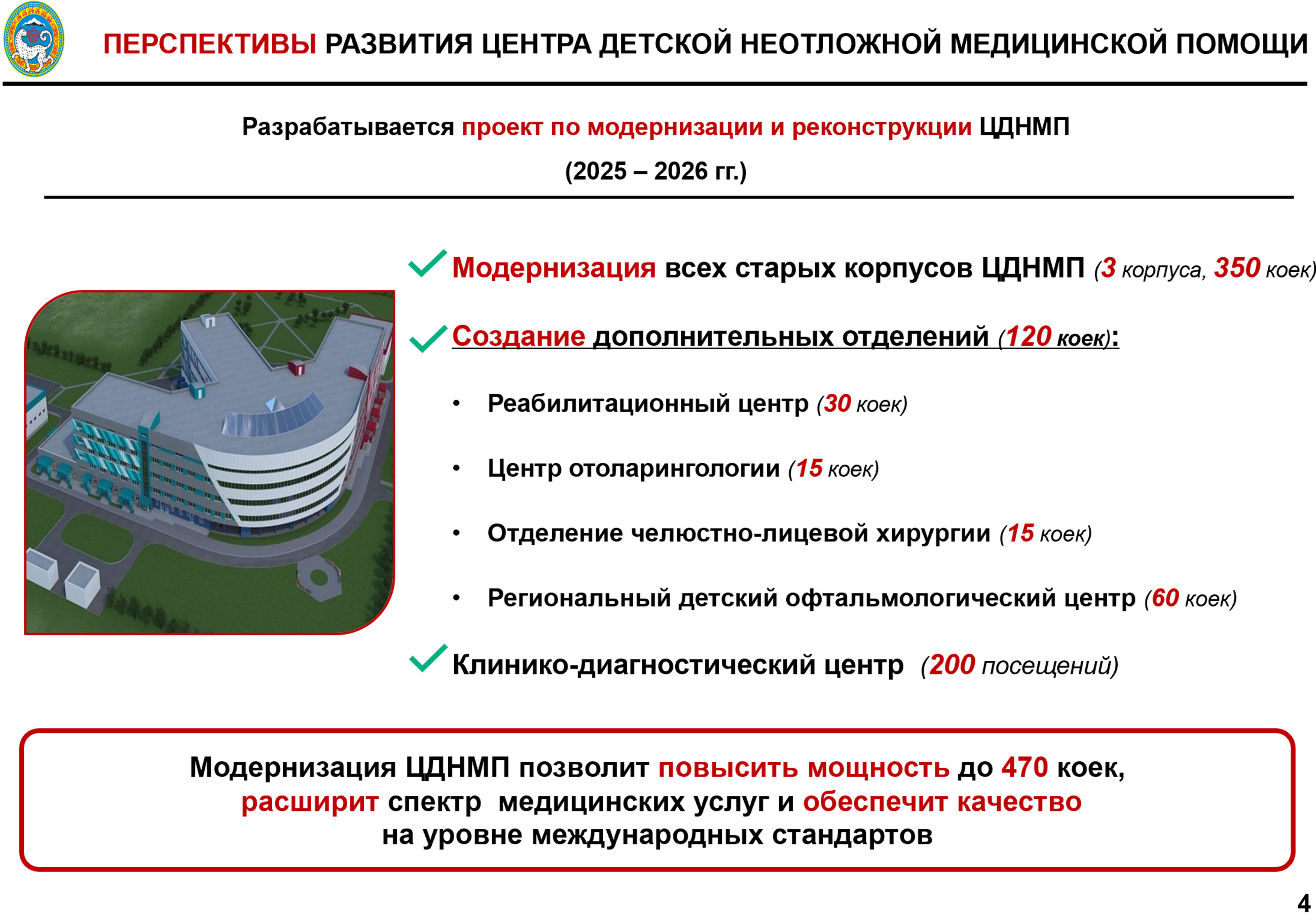 За последние три года количество обращений в приемное отделение Центра увеличилось на 30%. В настоящее время разрабатывается план по реконструкции клиники. В частности, будут капитально отремонтированы все старые корпуса и открыты отделения реабилитации, отоларингологии, офтальмологии, челюстно-черепной хирургии. В результате количество коек в больнице увеличится с 350 до 470. Модернизация позволит расширить спектр медицинских услуг и обеспечит качество на уровне международных стандартов.