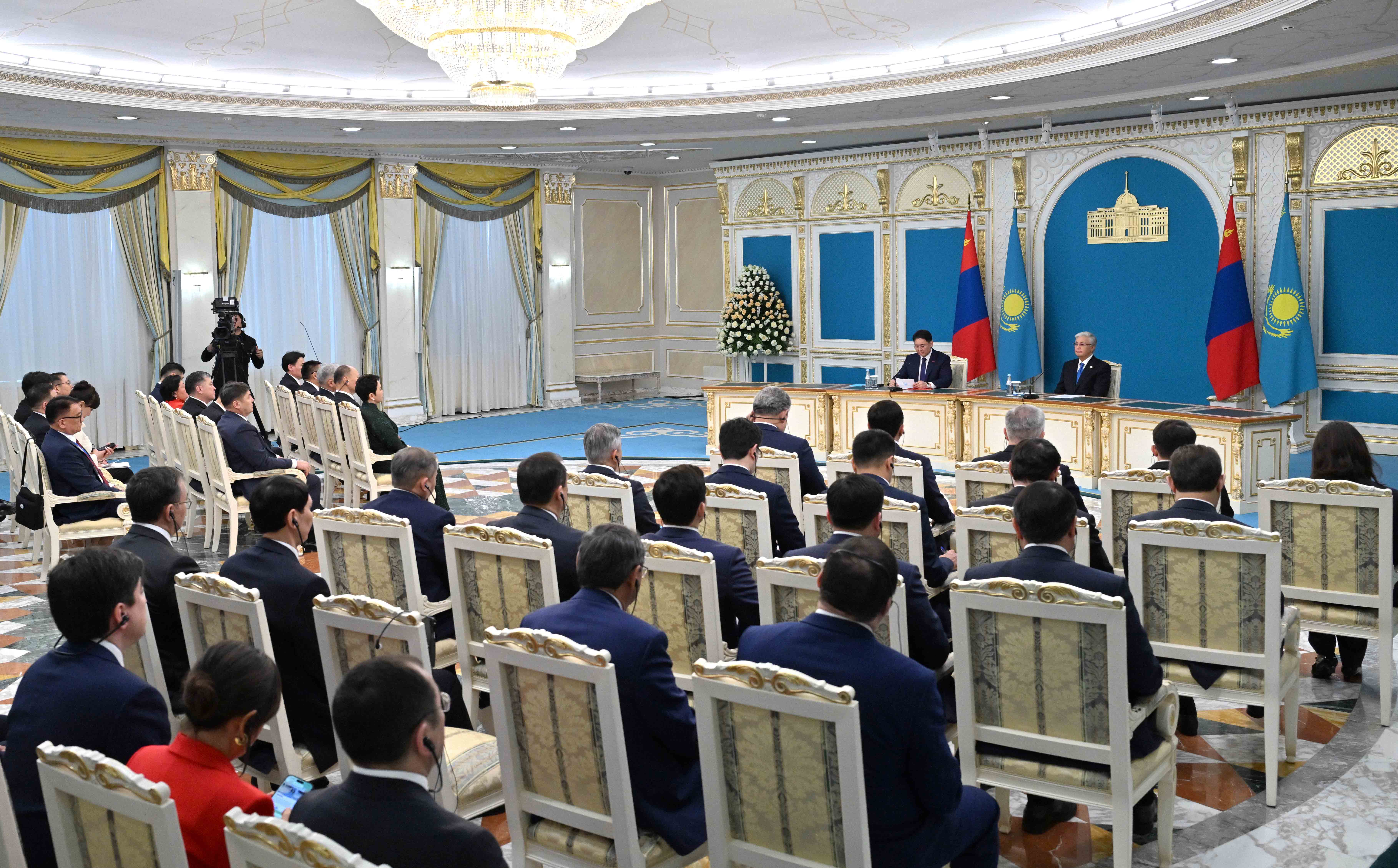 – Нас объединяют общие исторические и культурные корни.  Наши страны являются наследниками великой кочевой цивилизации и культуры юртовых жилищ. Мировоззрение и образ жизни наших народов глубоко созвучны. Поэтому мы неизменно оказываем взаимную поддержку и искренне радуемся успехам друг друга. Отрадно, что в последние годы двустороннее сотрудничество демонстрирует поступательную динамику. Как известно, полтора года назад я посетил с государственным визитом Улан-Батор. С большой теплотой вспоминаю сердечное гостеприимство, оказанное нашей делегации уважаемым г-ном Президентом Ухнаагийном Хурэлсухом и всем монгольским народом.  Тогда в рамках визита мы подписали Декларацию об установлении стратегического партнерства, которая стала историческим документом, еще более упрочивший многовековые узы братства между нашими народами. Между нашими государствами налажено активное межпарламентское и межведомственное взаимодействие. Успешно функционируют Межправительственная комиссия и Деловой совет. Уверен, что нынешний визит Президента Хурэлсуха придаст новый импульс двустороннему сотрудничеству, – сказал Касым-Жомарт Токаев.