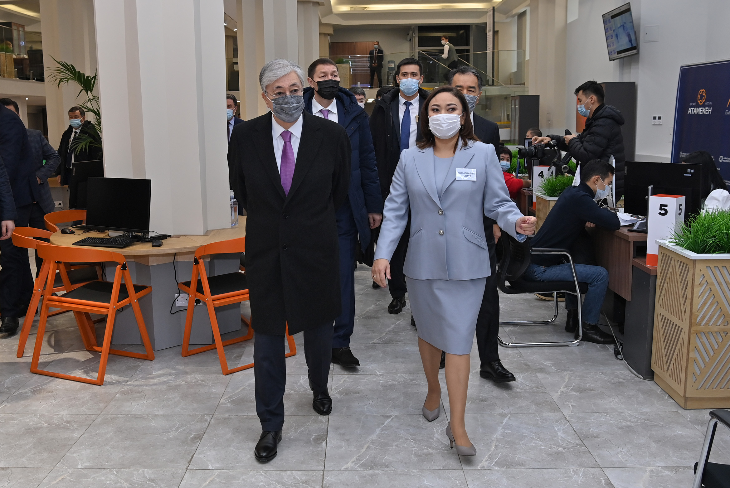 Президент осмотрел зал обслуживания, где ознакомился с проводимой здесь работой. Касым-Жомарту Токаеву рассказали, что центр на сегодня остается единственным подобным социальным объектом в стране. Данную практику планируется применять и в других регионах.