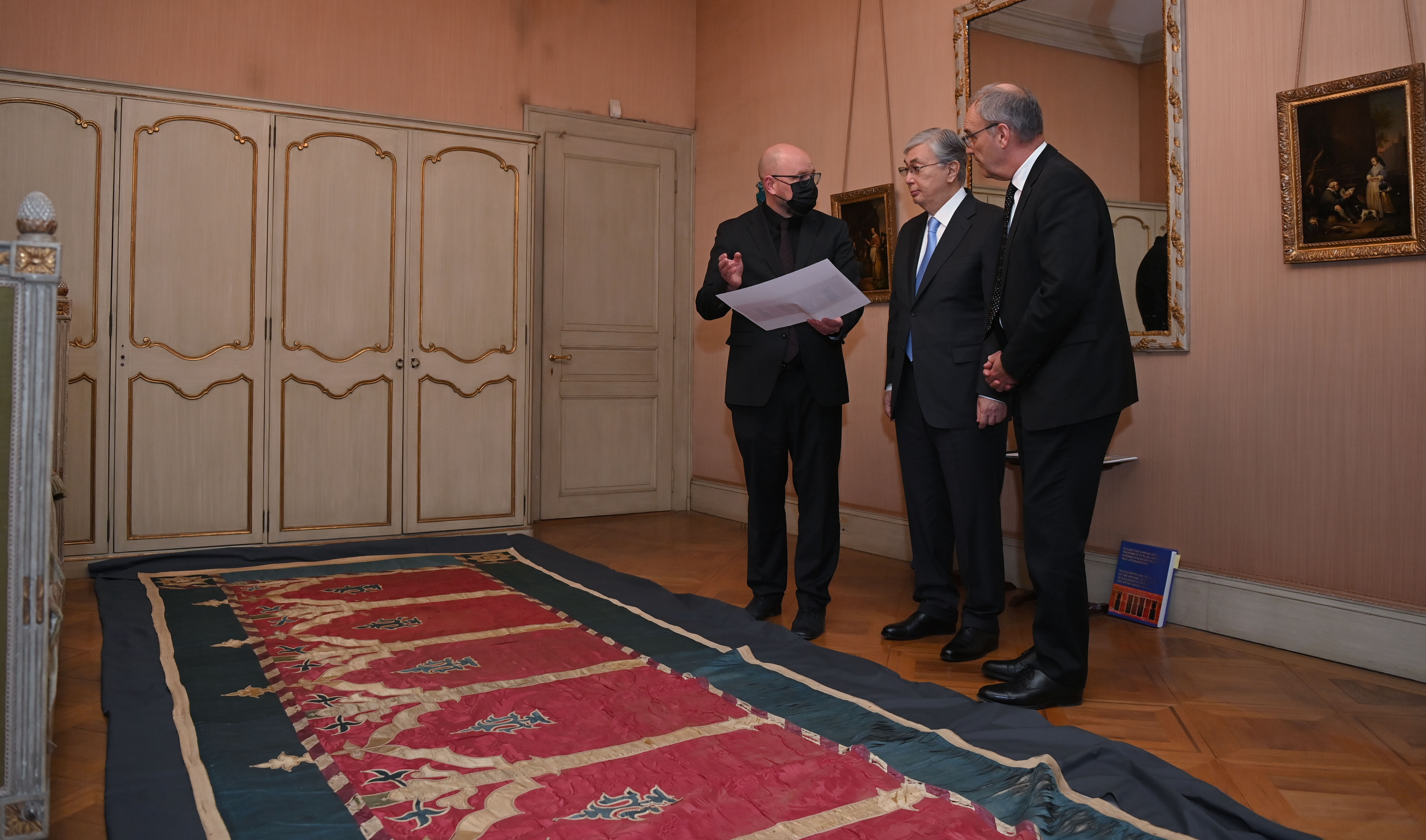 По завершении переговоров Президент Казахстана Касым-Жомарт Токаев и Президент Швейцарии Ги Пармелан совершили совместный осмотр казахского бархатного настенного фриза – одного из уникальных экспонатов коллекции известного дипломата и путешественника Анри Мозера.